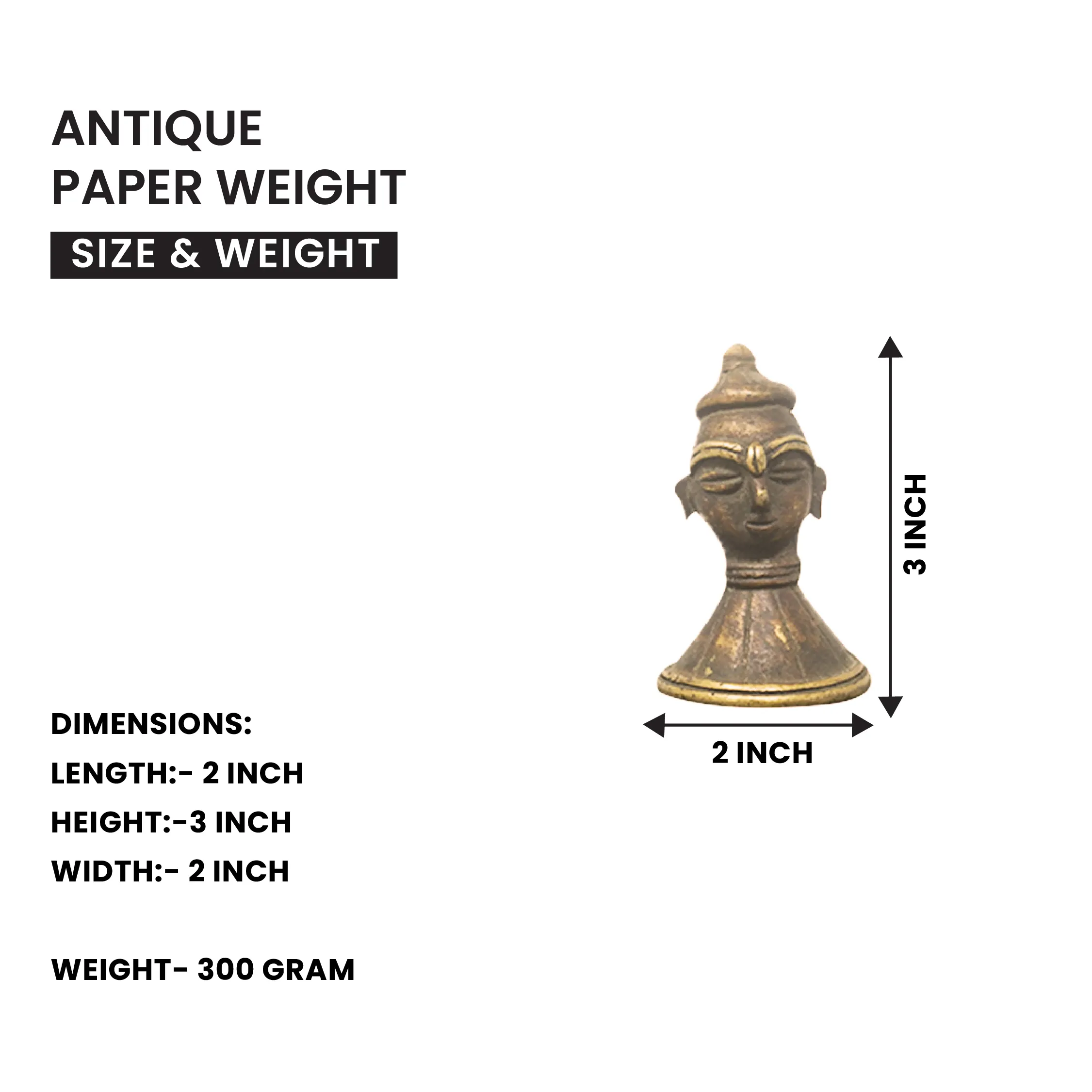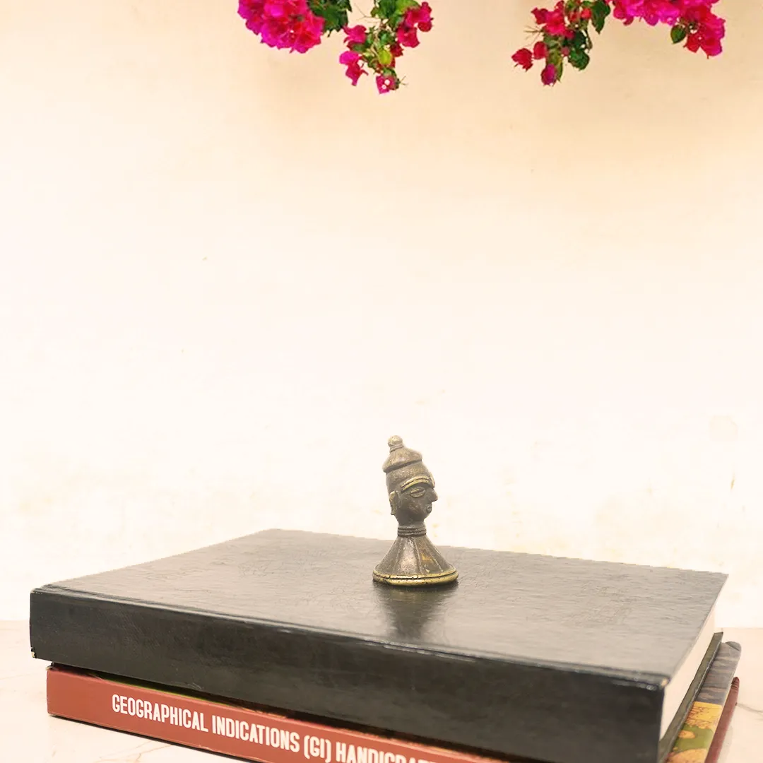 Add bold character and heritage charm to your space with the Kalasathi Warrior Face Bust Paperweight, a striking miniature sculpture handcrafted from solid pure brass. This powerful bust represents the valor and pride of ancient warriors, featuring detailed facial expressions and traditional warrior headgear, all finished in a premium antique tone.