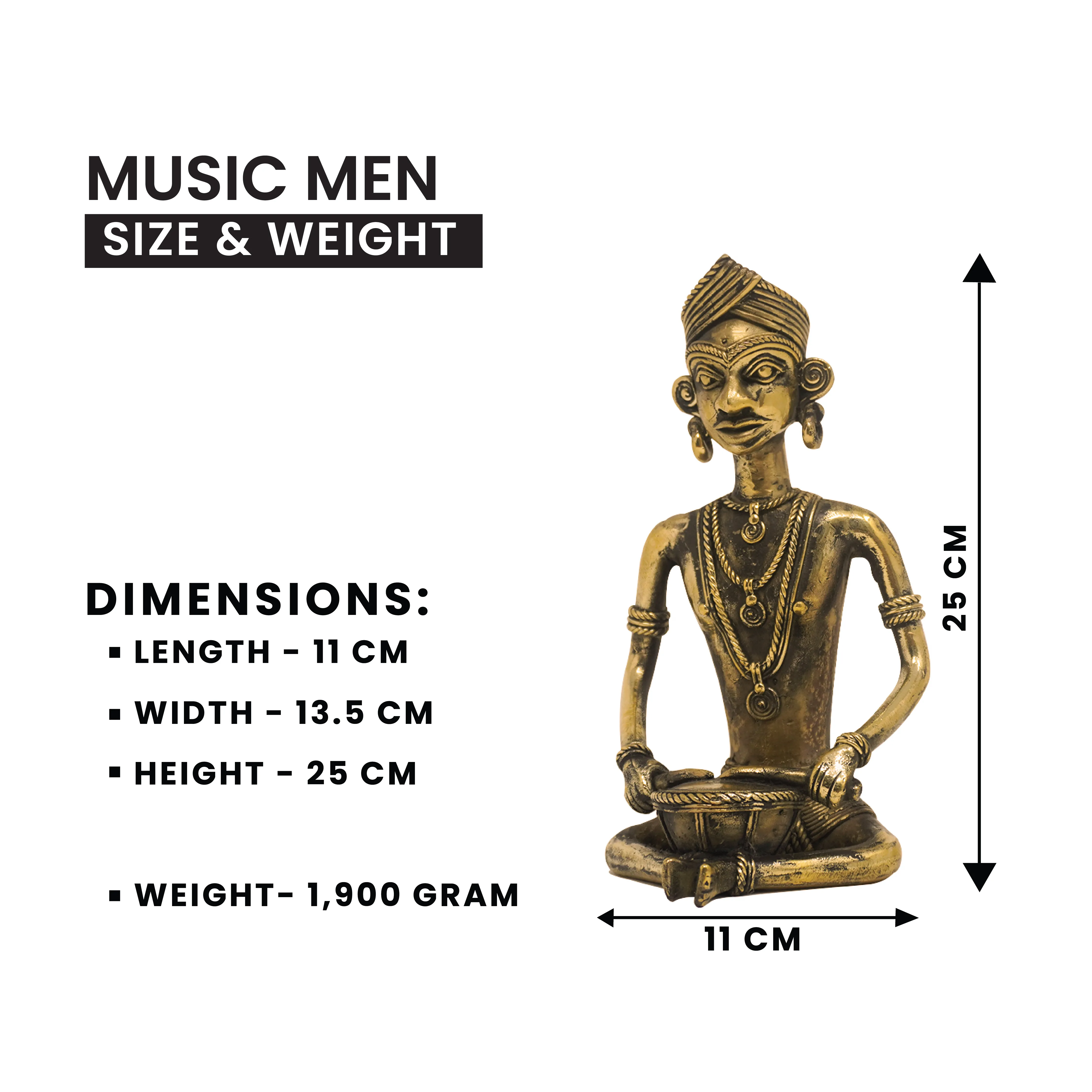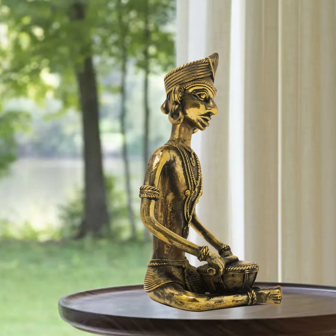 Painstakingly handcrafted by artisans in Betul, Madhya Pradesh, these statues use the ancient Dhokra (lost-wax) metal casting technique, known for its raw texture and organic design. The antique brass finish enhances the detailed patterns on each figure, making them perfect for living room décor, office spaces, or gifting during festivals and weddings.
